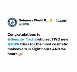 Former Big Brother Naija housemate, Anita Natacha, popularly known as Tacha, has officially been recognised by Guinness World Records (GWR) for setting two new world records, the most cosmetic makeovers in eight hours and 24 hours, respectively.