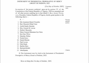 President Bola Tinubu has executed the relevant instruments of release to complete the process of formally exercising his constitutional power of prerogative of mercy to grant pardon and clemency to specific individuals who were earlier convicted for various offences.